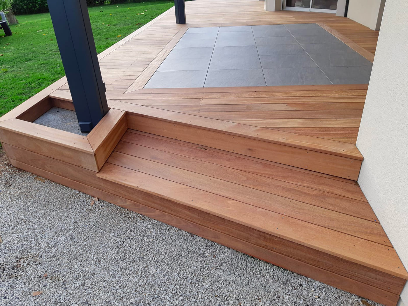 Mise en œuvre par nos artisans qualifiés sur votre chantier. Nous maîtrisons toutes les étapes : préparation du terrain, pose sur plots réglables, installation des lames bois exotiques ou composites et tous travaux d’étanchéification nécessaires.